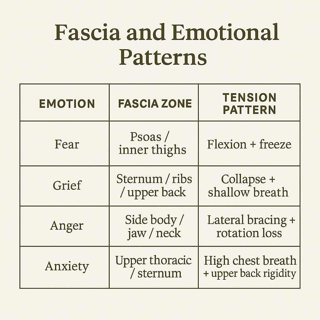 When emotions don’t get metabolized psychologically, the fascia compensates by tightening, thickening, or reducing glide, especially around areas tied to the organ-emotion system.